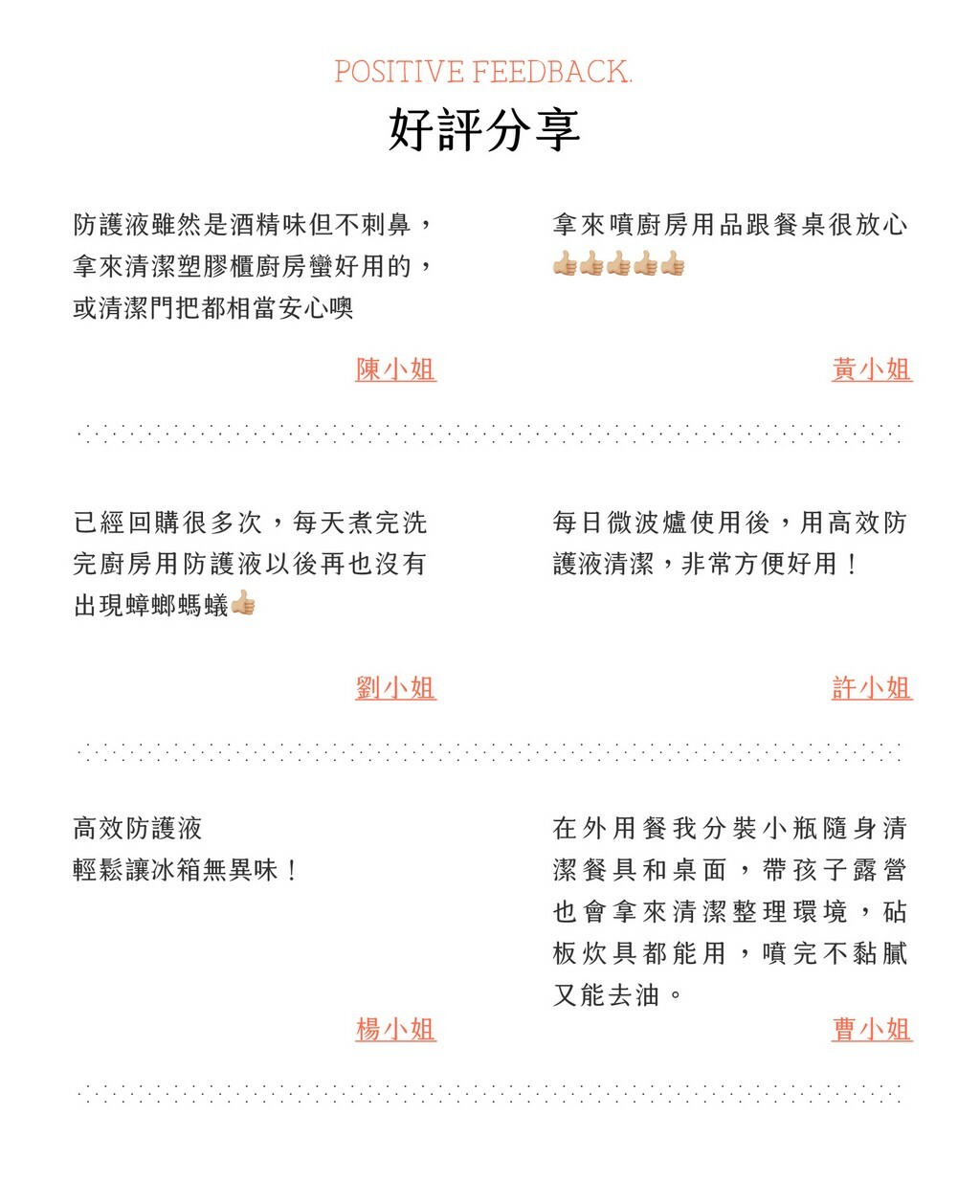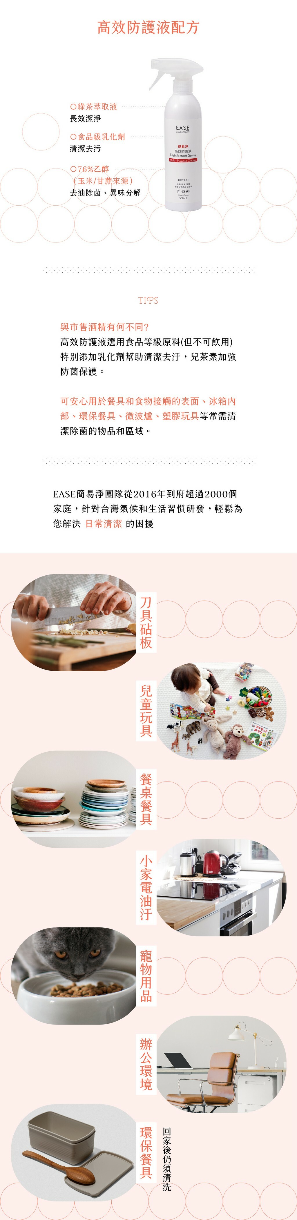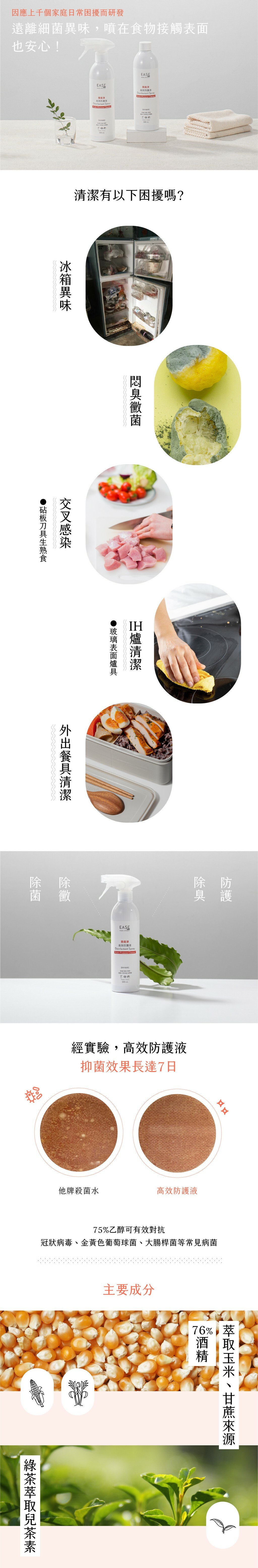 高效防護液採用蔗糖酒精75%及兒茶素製成,可以使用在一般環境除菌清潔、防霉及除臭。因添加食品等級乳化劑,也可以使用在砧板,料理器具,冰箱等區域做清潔防護。