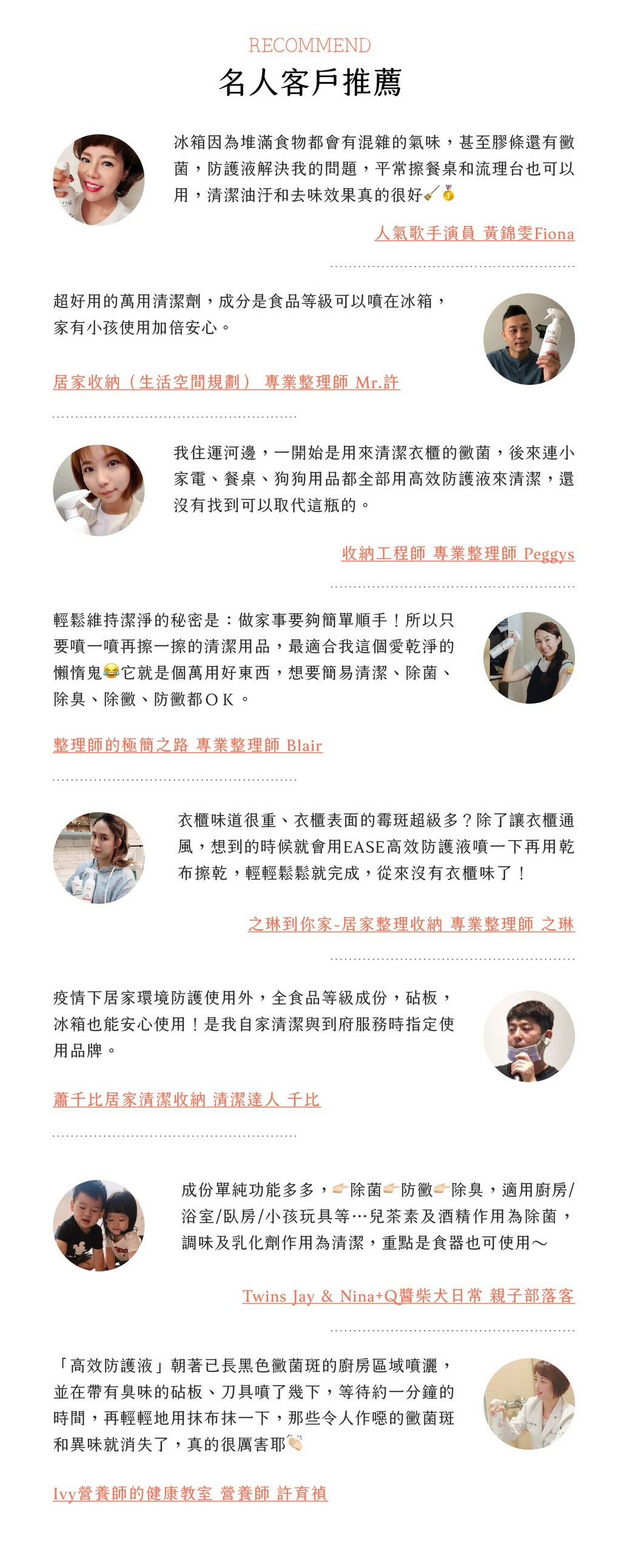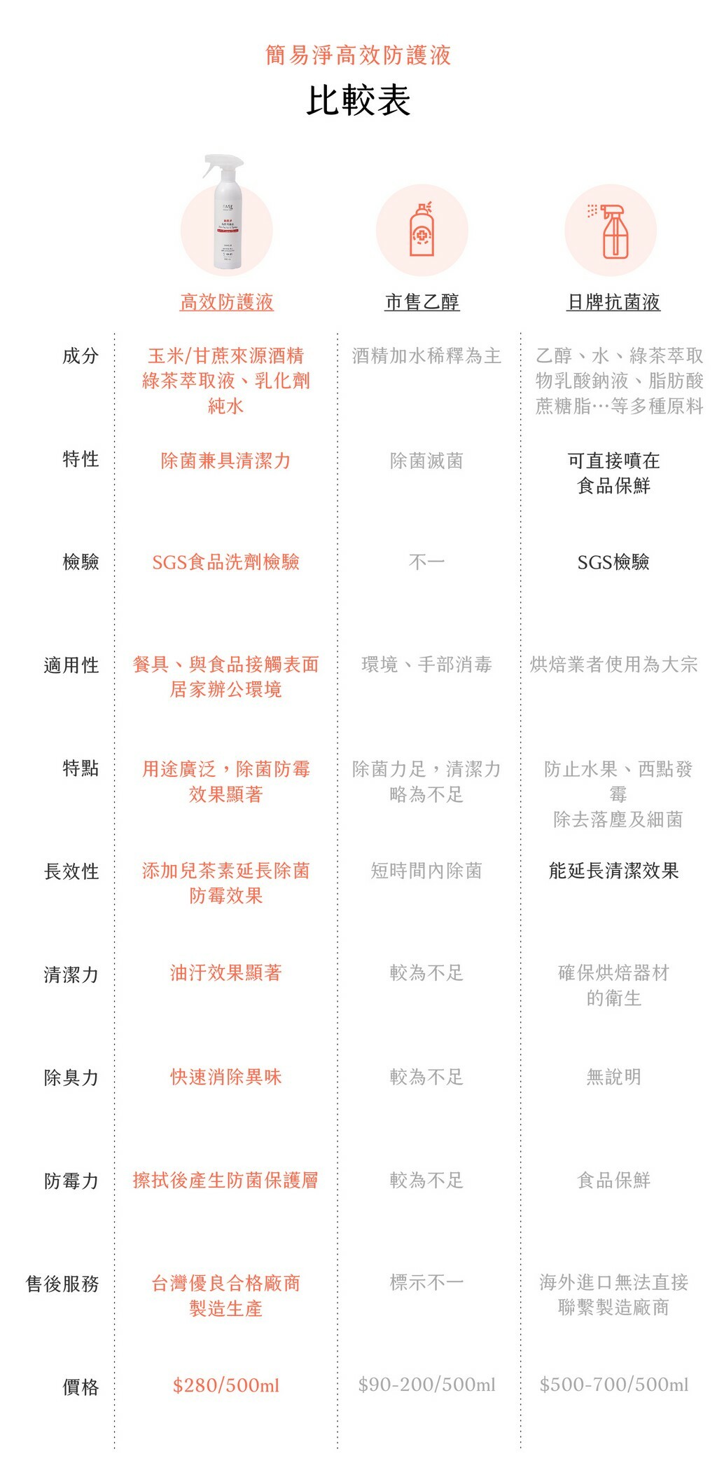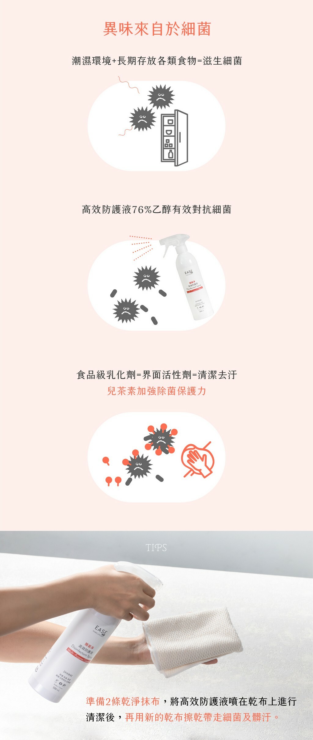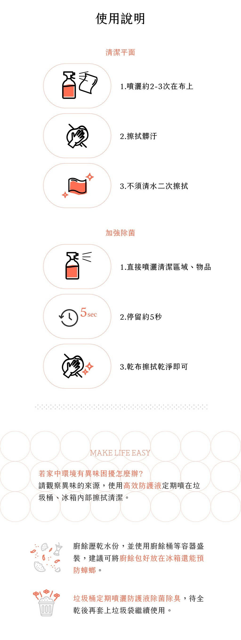 高效防護液採用蔗糖酒精75%及兒茶素製成,可以使用在一般環境除菌清潔、防霉及除臭。因添加食品等級乳化劑,也可以使用在砧板,料理器具,冰箱等區域做清潔防護。
