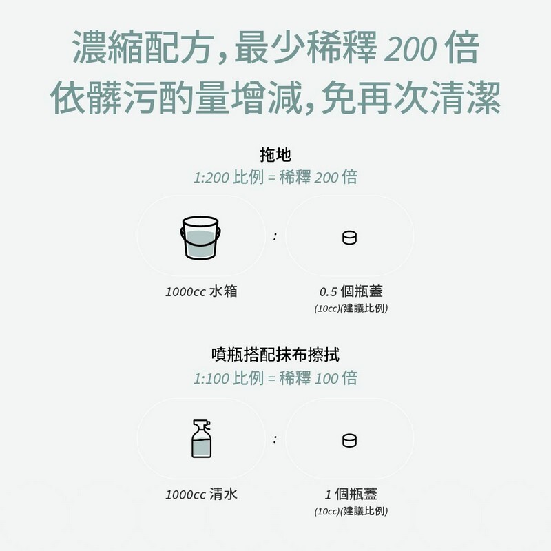 A9:3款地板精華液都是以天然植物為基底,氣味自然清爽,可自行調整濃淡,建議最少稀釋100倍以上使用喔!