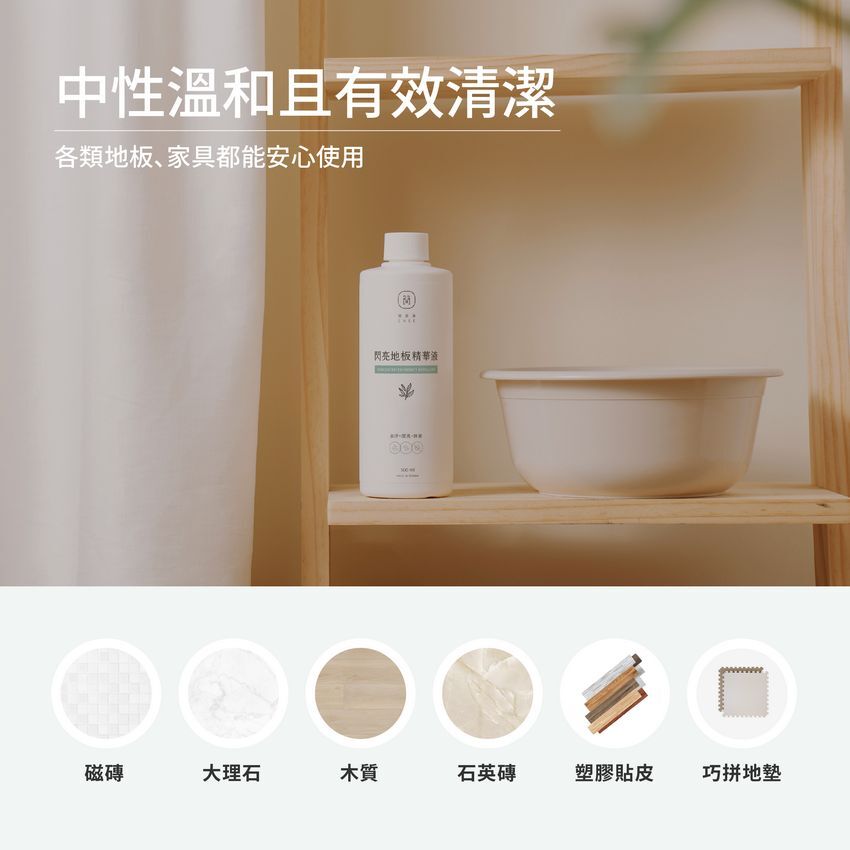 A6:地板精華液為中性,任何材質(大理石、木頭、石塑、巧拼…)都能安心使用。