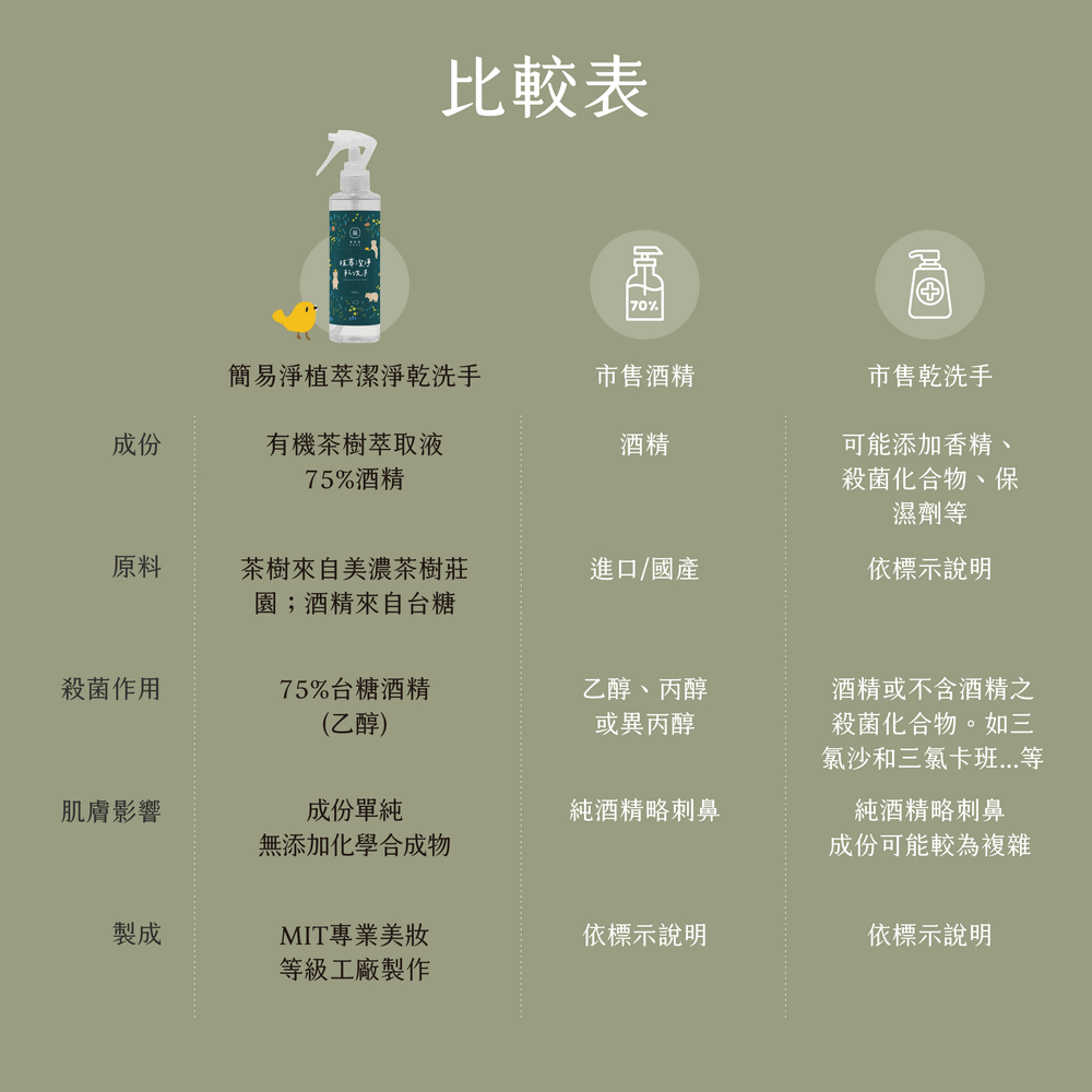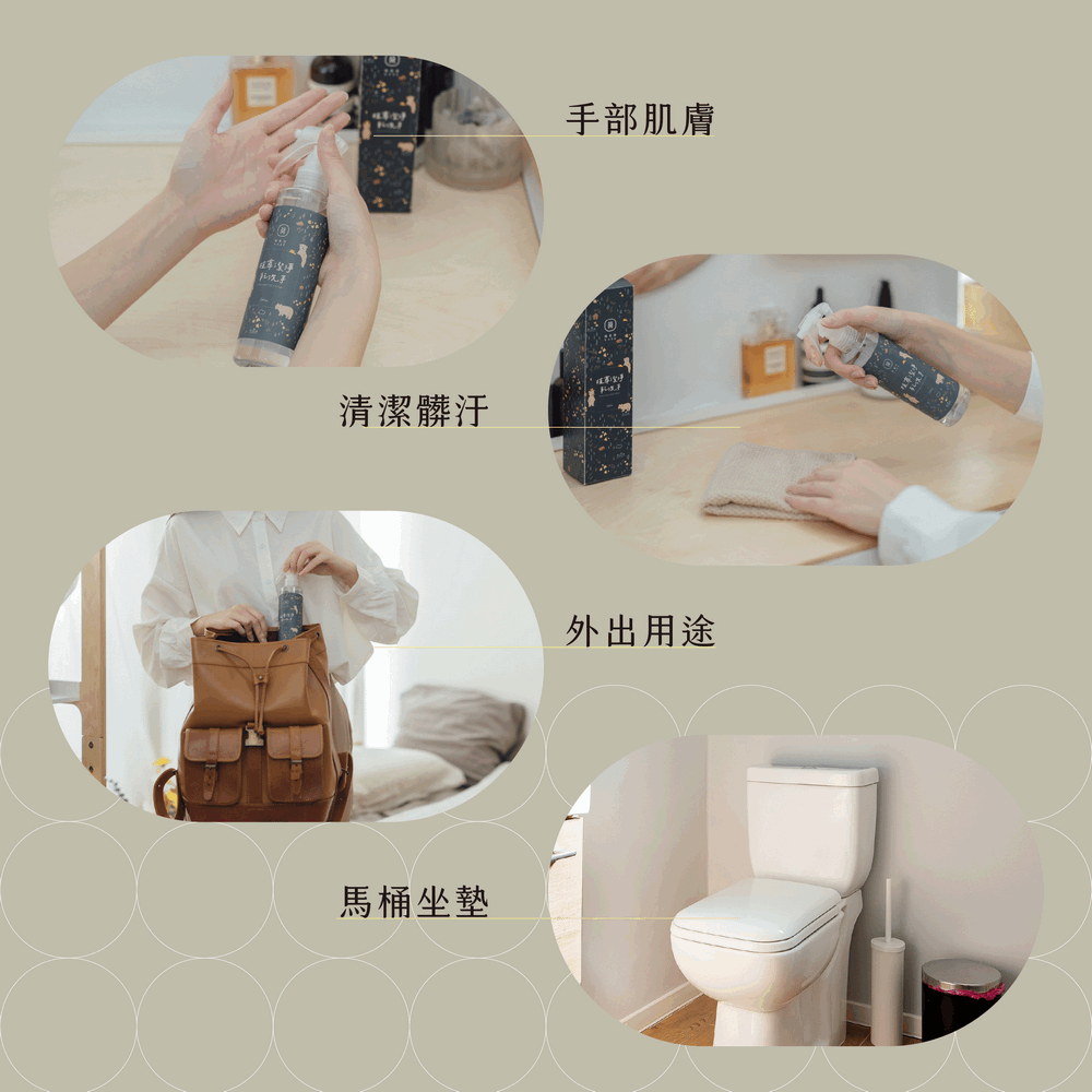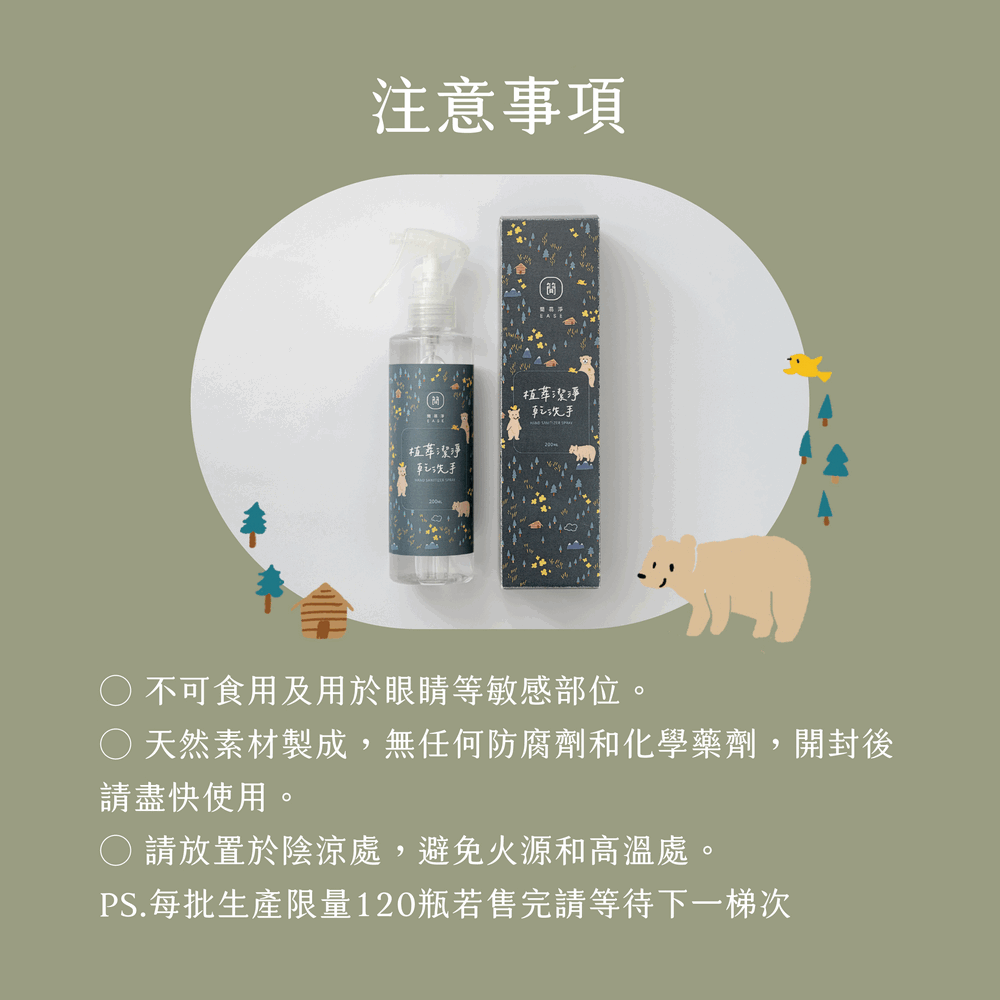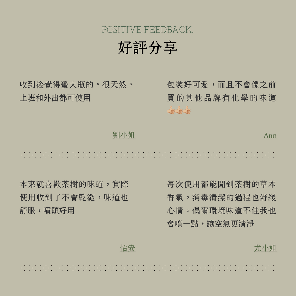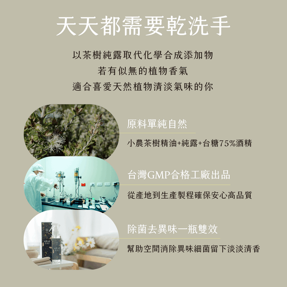 獨家與美濃小農合作,手摘100%有機茶樹與台糖75%酒精製成,堅持「不使用化肥、與自然共生耕種、少量新鮮生產」。以多道蒸餾方式提煉萃取,無添加任何化學合成物與香精,開封後請盡快使用。
