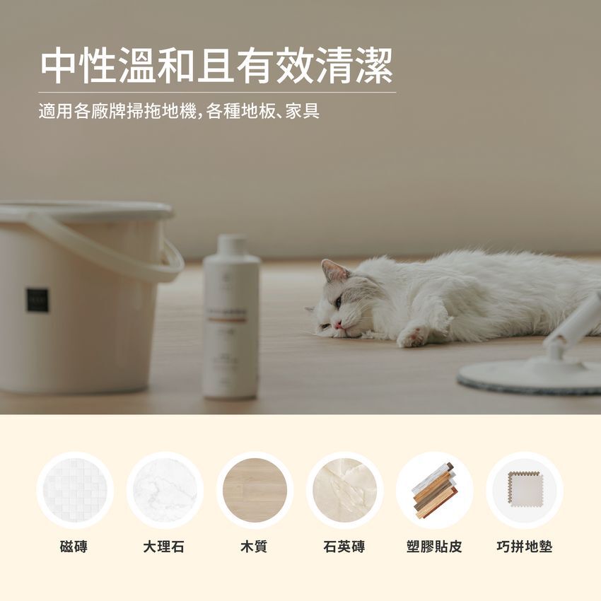 A6:地板精華液為中性,任何材質(大理石、木頭、石塑、巧拼…)都能安心使用。