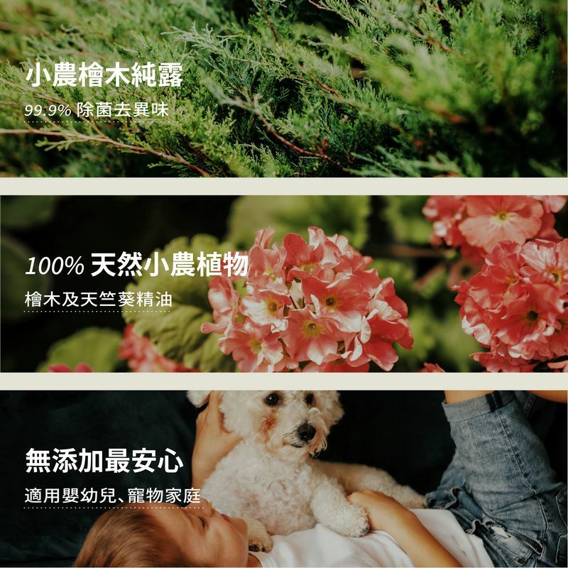 來自台灣森林的檜木純露,加上驅蟲植物精油天竺葵,感受靜謐沉穩的木質調,潔淨居家環境,讓家增添大自然的森林香氣。